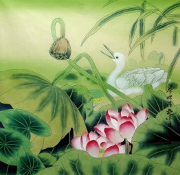 Chinese Egret /and Reed and Lotus Painting: 一路连科. "Egret(鹭)" and "road(路)", "lotus(莲)" and "connect(连)", "reed(芦)" and "road(路)" are homonyms in Chinese, and reed is often growing together with lotus in groups(in Chinese, it sounds like the word "lian ke,连科"), so this combination symbolizes "success in the imperial examinations again and again" and "having a successful official career".