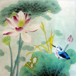 Chinese Mandarin Duck and Lotus Painting: 鸳鸯戏荷, 鸳鸯贵子. (A pair of mandarin ducks, lotus flower and seeds) The mandarin ducks often appear in pairs, so they symbolize the perfect couple since ancient China, and they are regarded as an auspicious symbol of love and marriage. Lotus seed symbolizes "having lovely babies". This combination implies a perfect couple living in harmony and mutual respect and growing old together.